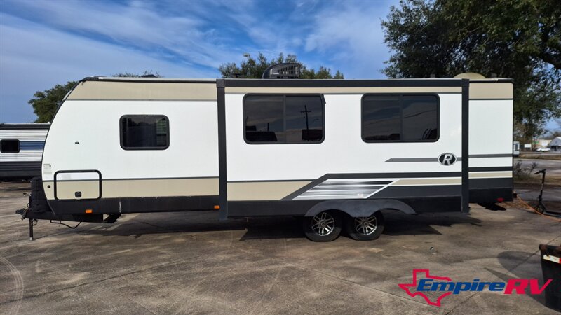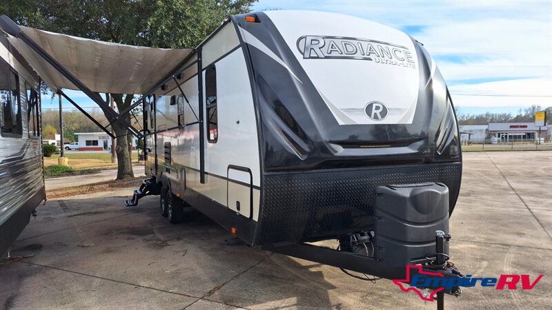 Clean and ready to camp! This 2019 Radiance 25RB travel trailer features a spacious rear bathroom, large slide-out, queen bed, full kitchen, and power awning. Lightweight and easy to tow.