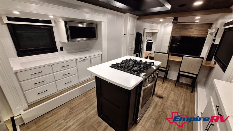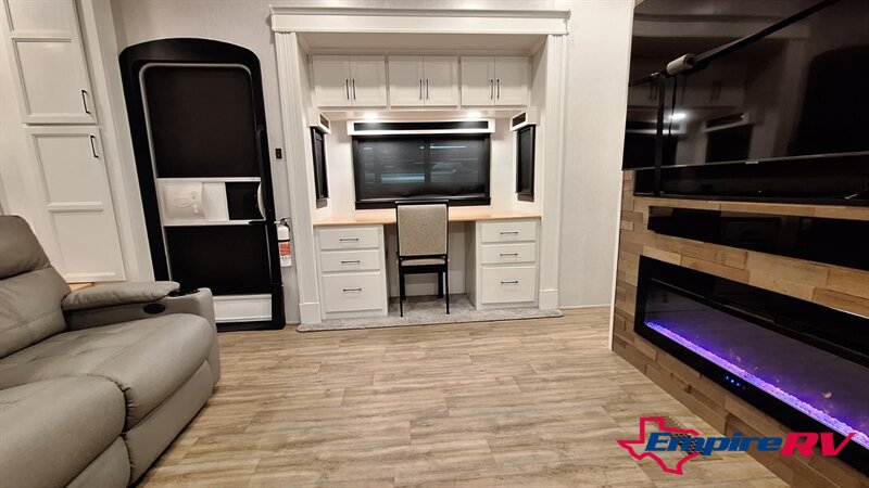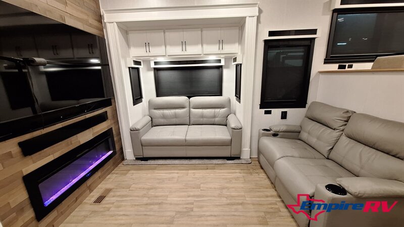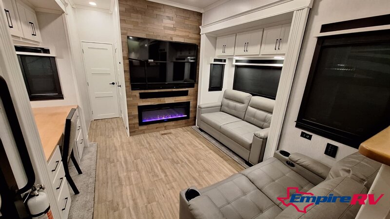 The Riverstone Legacy 391FSK features a spacious mid-living area with power theater seating, a large entertainment center, and an electric fireplace. The master suite includes a king bed, walk-in closet, washer/dryer prep, and a luxurious spa-inspired bathroom with dual sinks and a walk-in shower. High ceilings, premium cabinetry, and luxury furnishings provide true residential comfort.