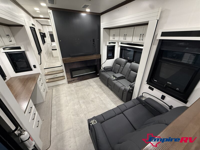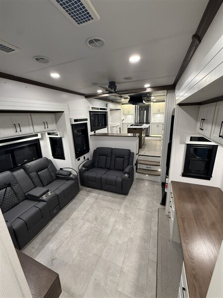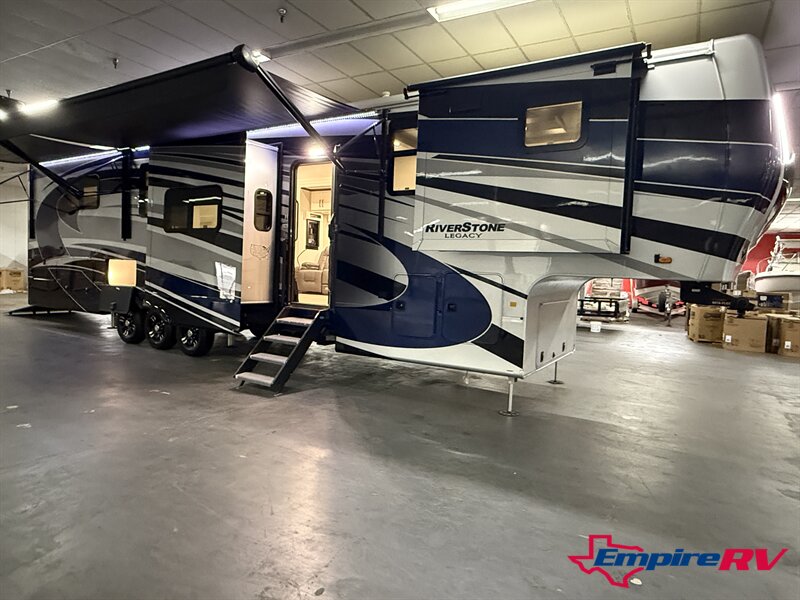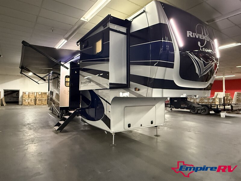 The 2024 Forest River Riverstone 42FSKG Legacy Edition is a flagship luxury toy hauler fifth wheel built for full-time RV living and extended travel, combining residential comfort with a unique below-floor garage design that preserves a true luxury front-kitchen layout. With five slide-outs and triple 7,000-lb axles, this Riverstone delivers exceptional interior space, towing stability, and high-end construction throughout.