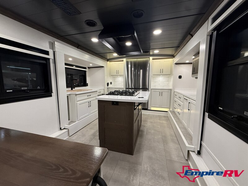 If you're looking for a front-kitchen luxury fifth wheel toy hauler with stackable washer and dryer, full-body paint, and premium Legacy construction, this 2024 Riverstone 42FSKG delivers residential comfort with serious hauling capability.